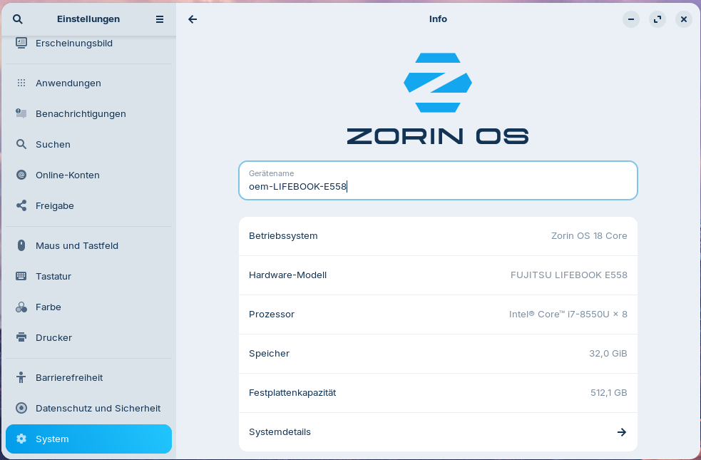 | Betriebssystem | Zorin OS 18 Core (Vorinstalliert & Konfiguriert) |
